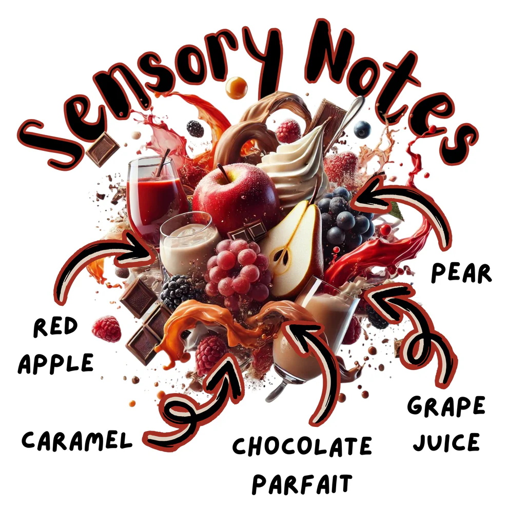 Piros alma • Csokoládéparfé • Szőlőlé • Körte • Karamell